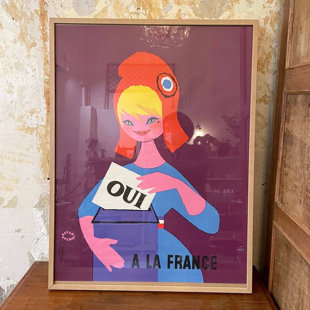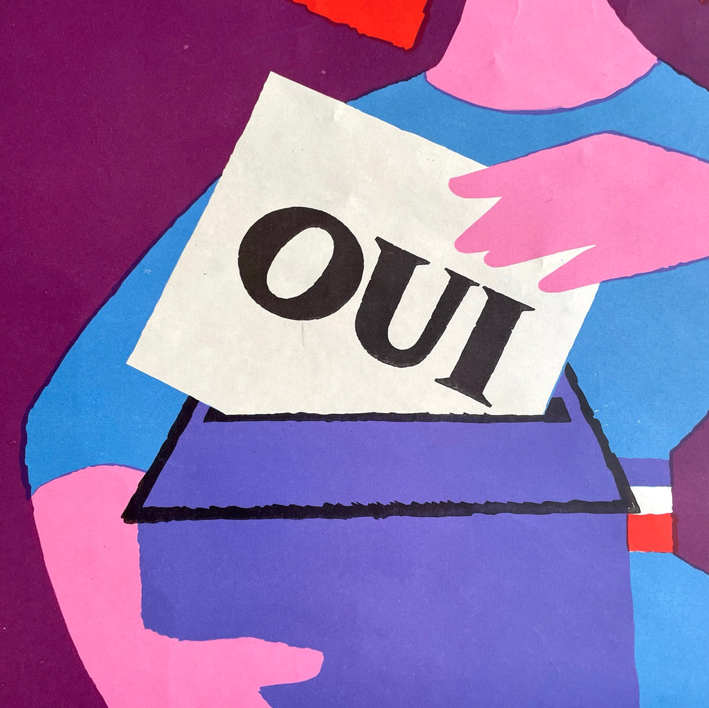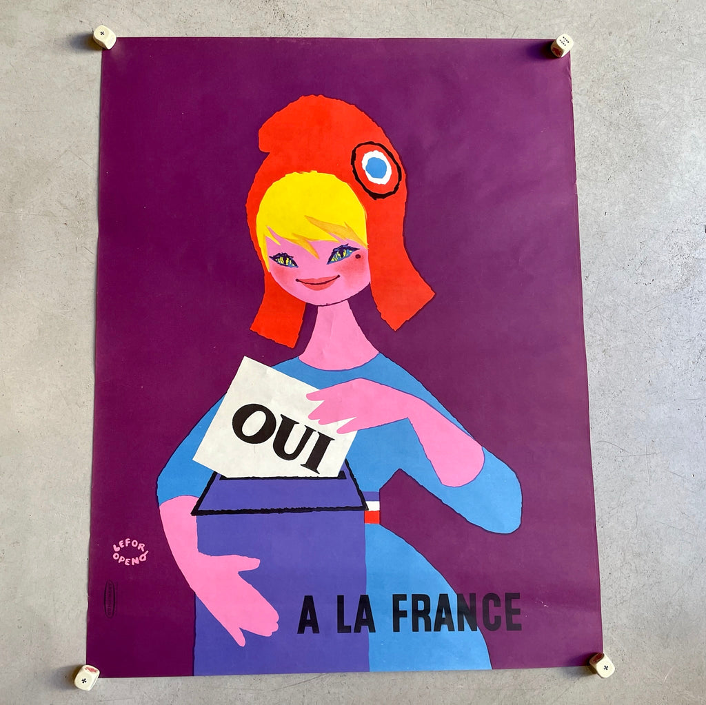 Lithographie de 1958 pour le référendum de 1958. Couleurs lumineuses sur fond violet.