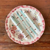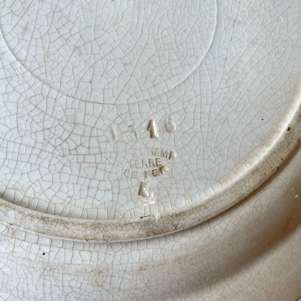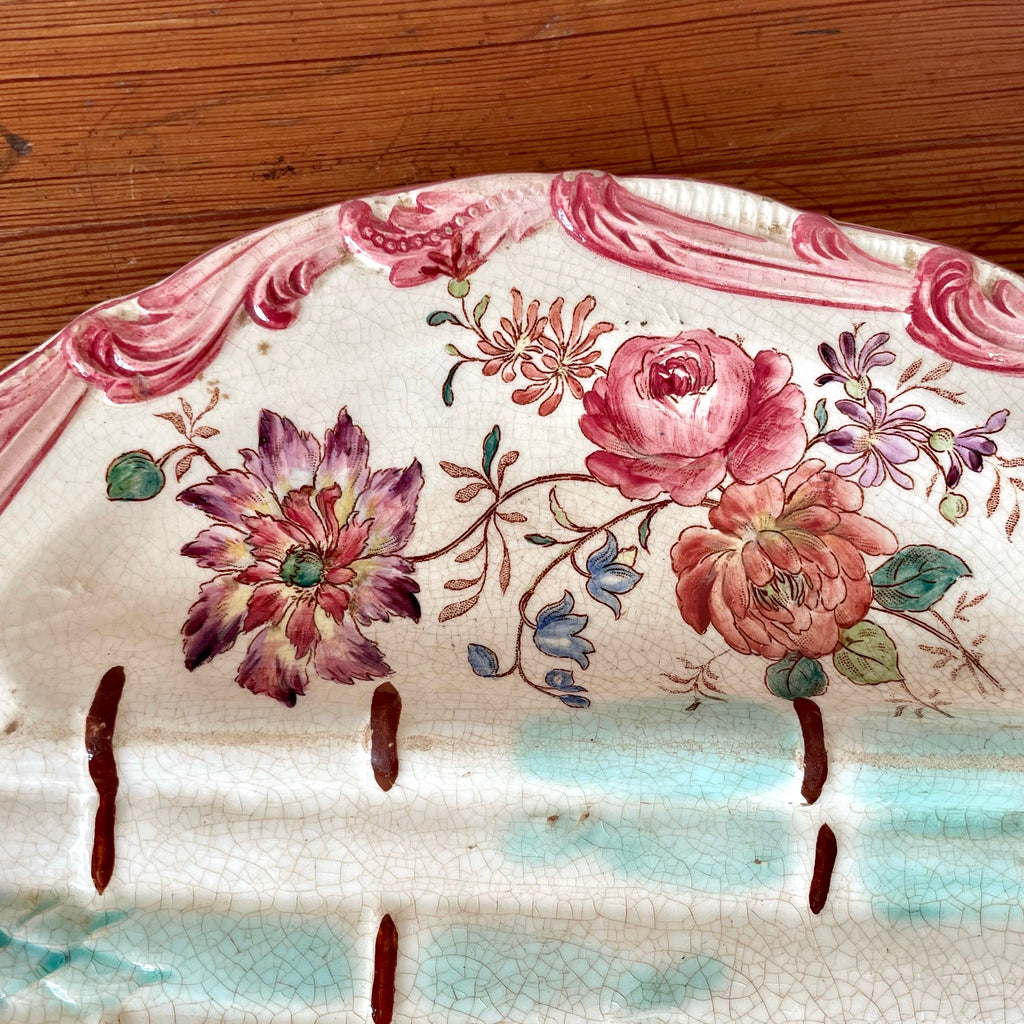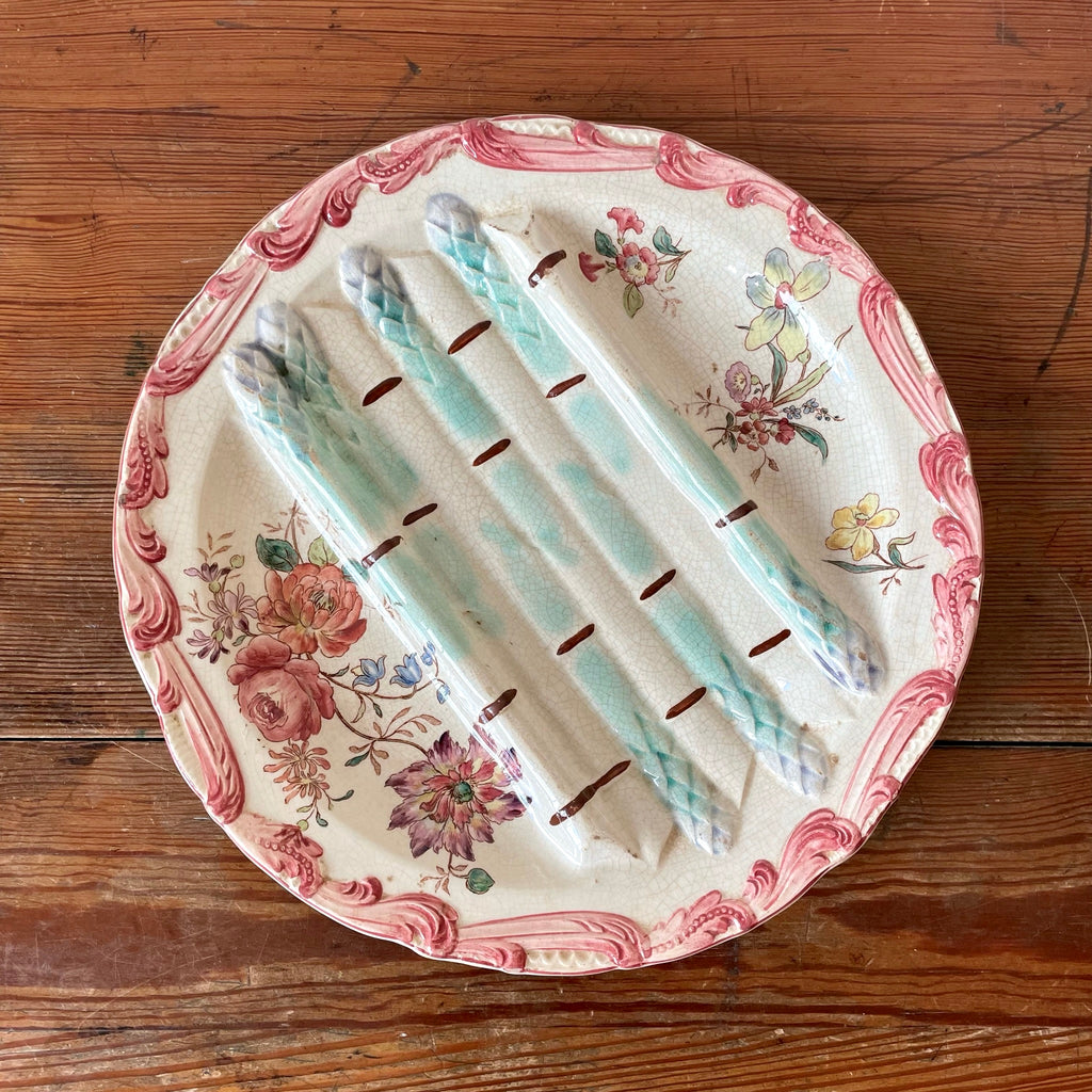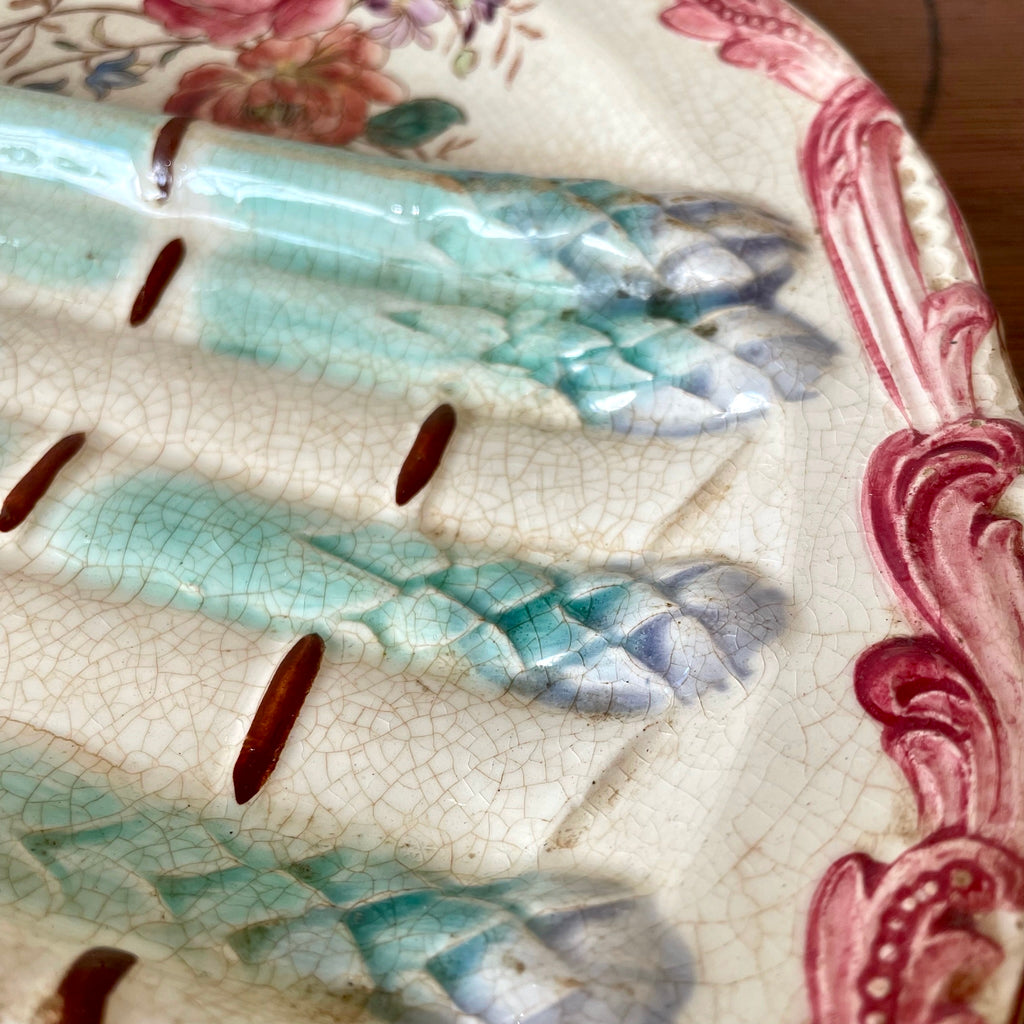 Grande assiette à asperges en faïence fin XIXe. Décor de fleurs polychrome et d'asperges en relief dans les tons vert d'eau et rose.