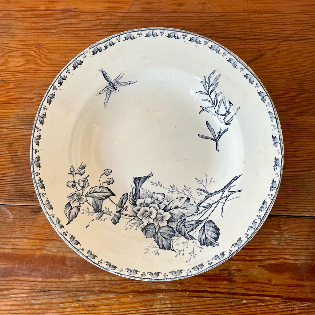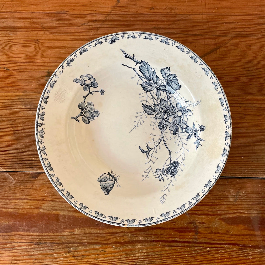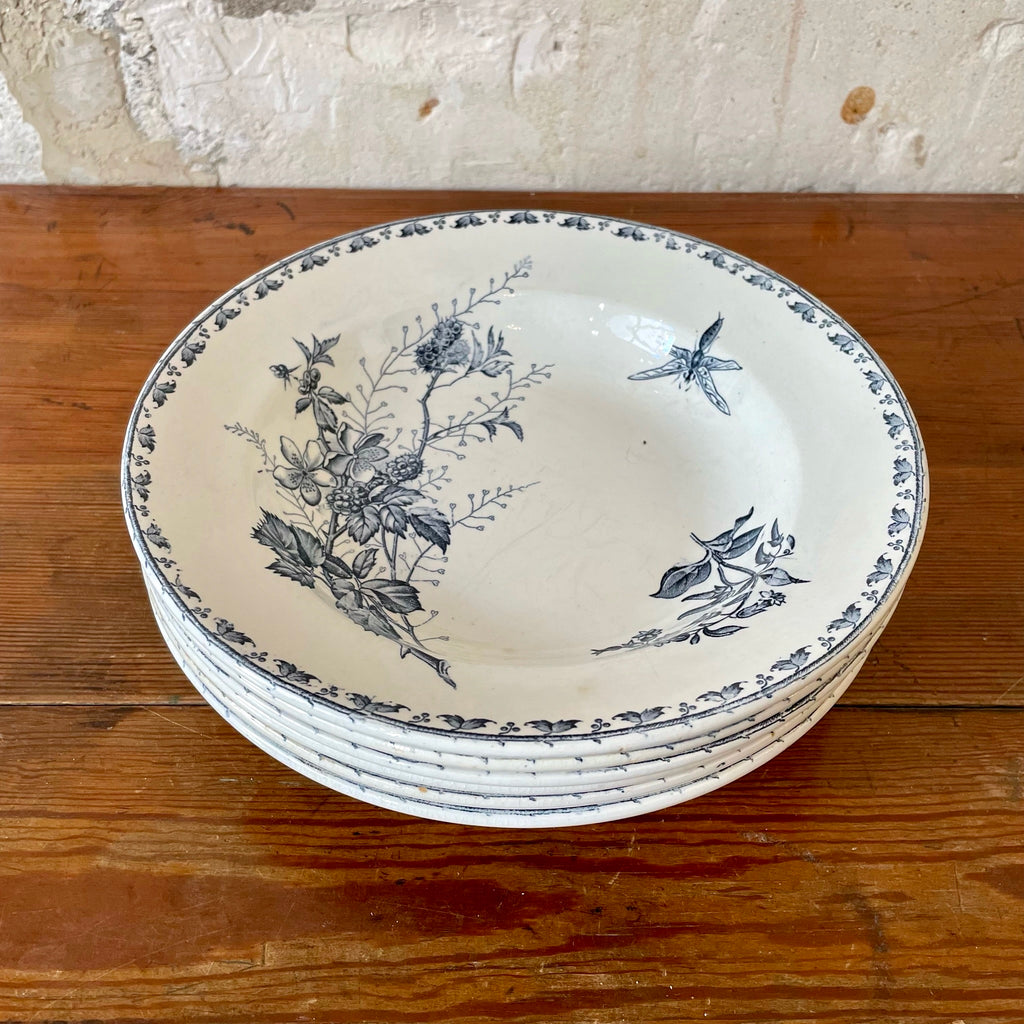 Joli décor bleu foncé qui change. Toutes les assiettes sont différentes. Décor de fleurs, feuillages et papillons ou libellules.