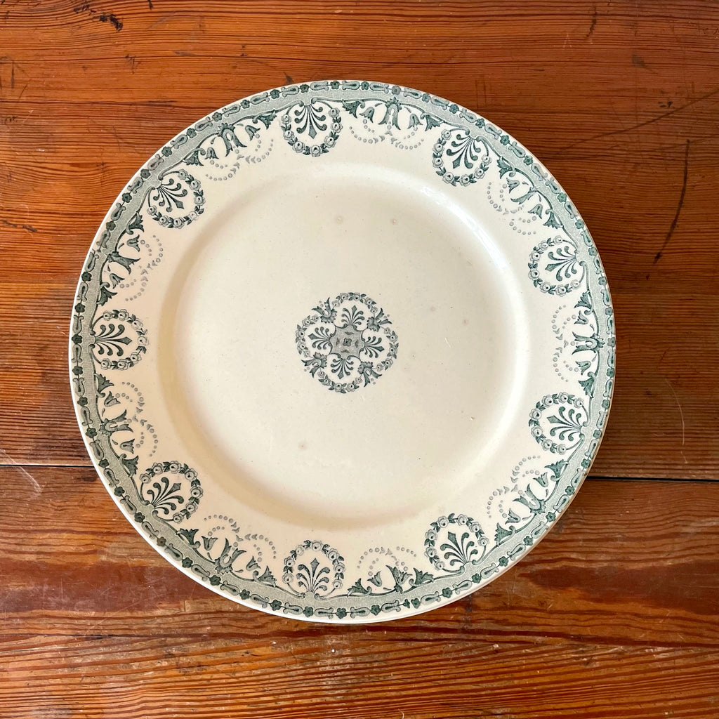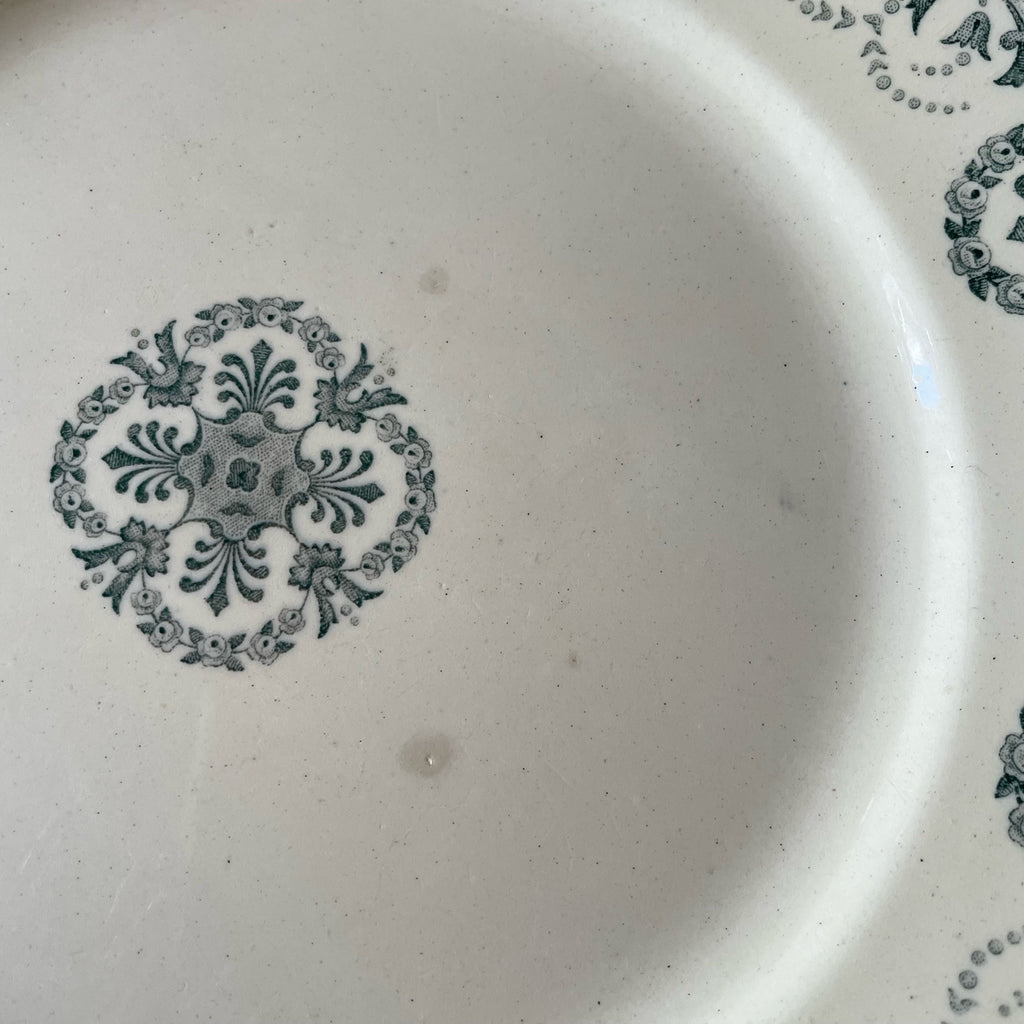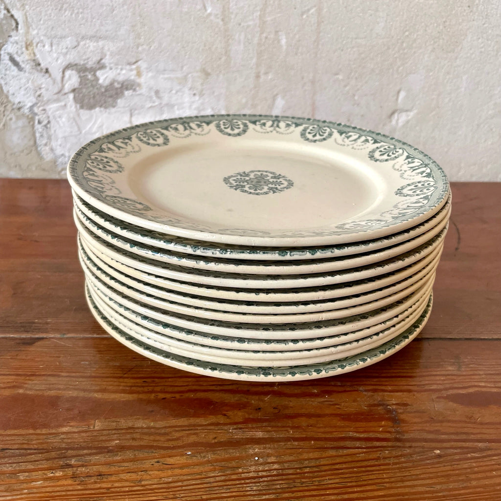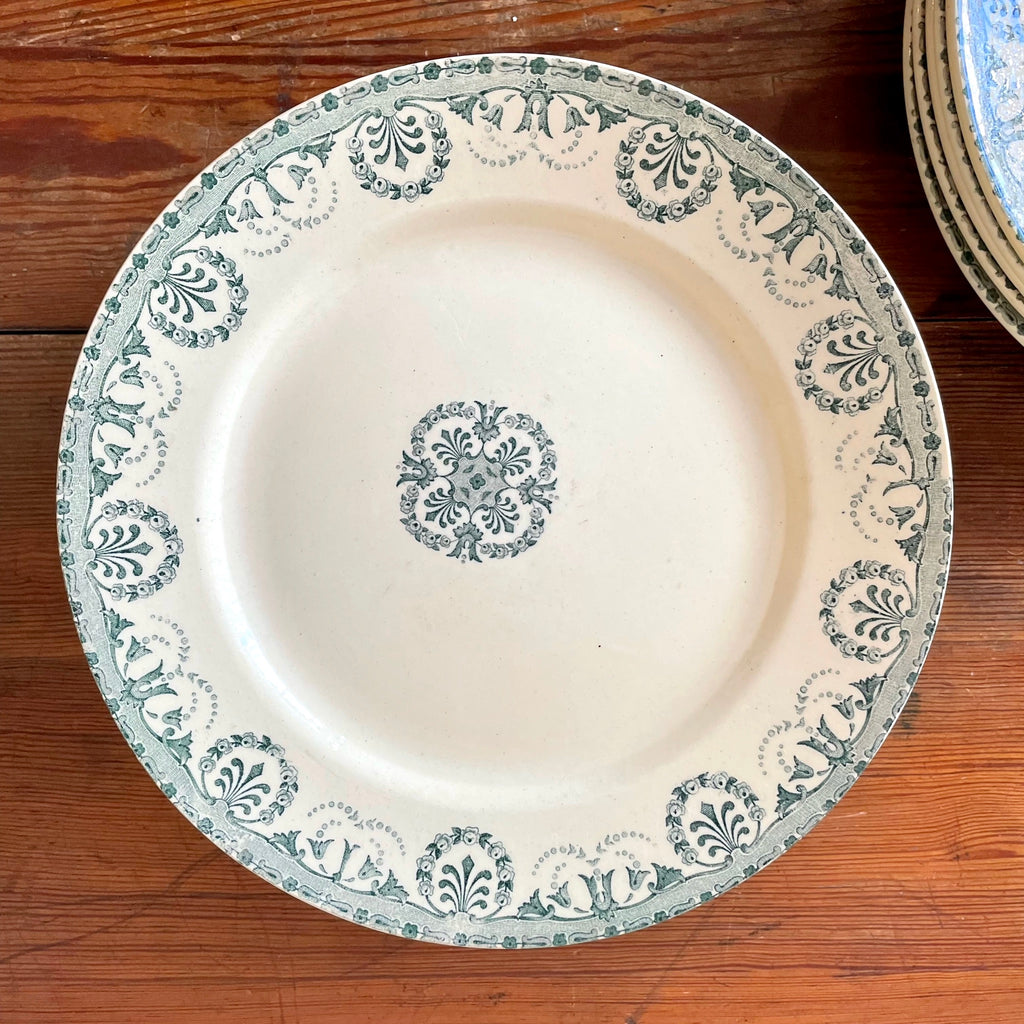 Belles assiettes anciennes au décor de guirlandes végétales dans les tons de vert. Début XXe. Bon état, quelques petites piqures.
