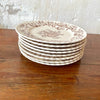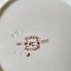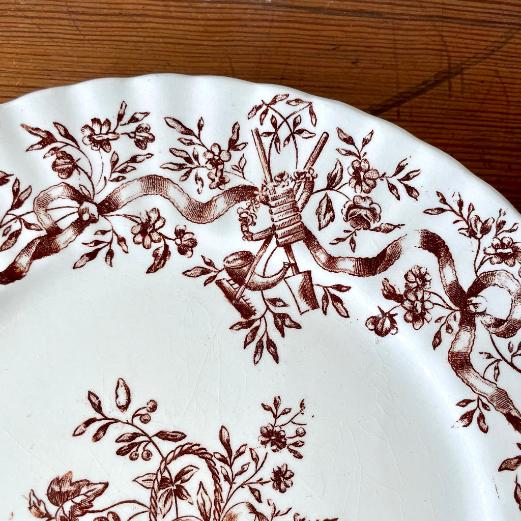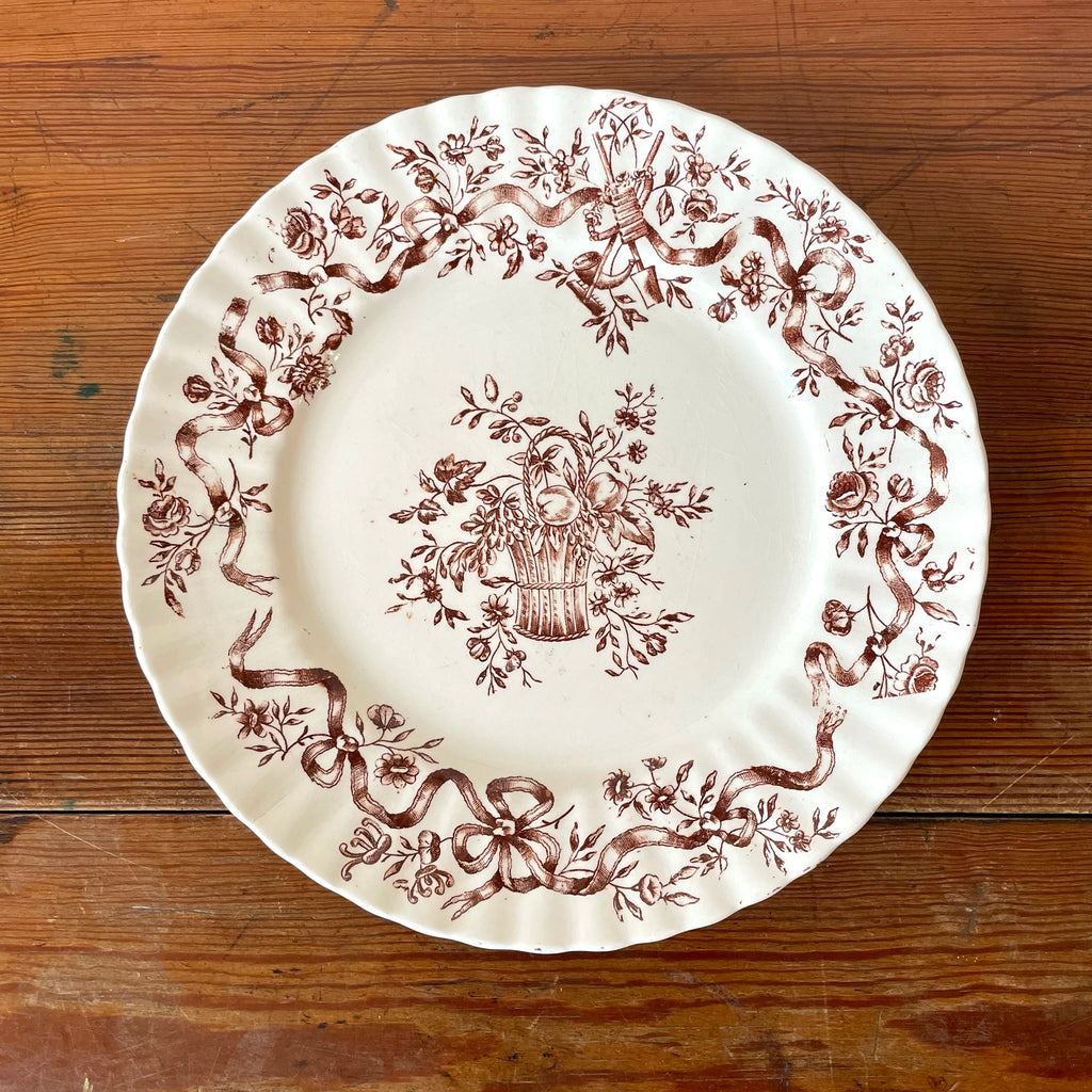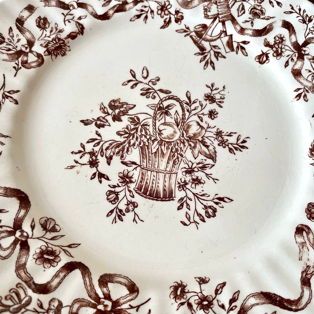 Assiette plate en faïence de Longchamp au décor de panier de fruits et rubans fleuris de couleur brune.