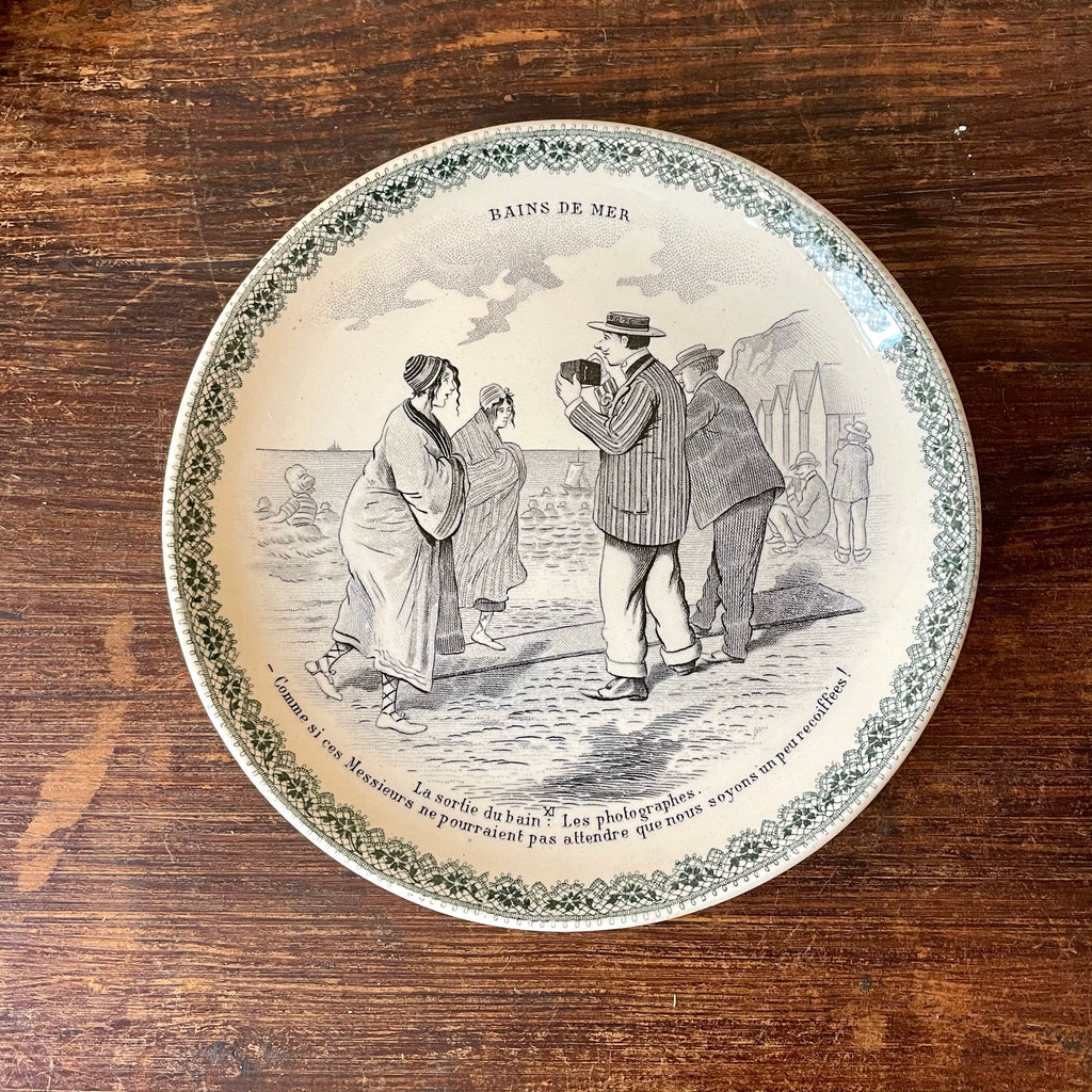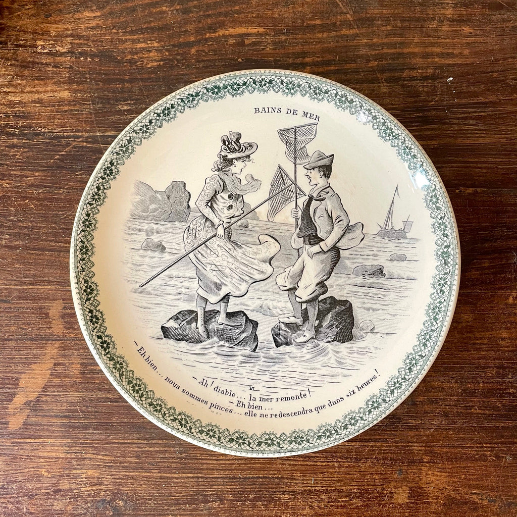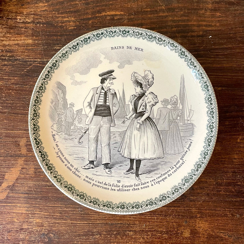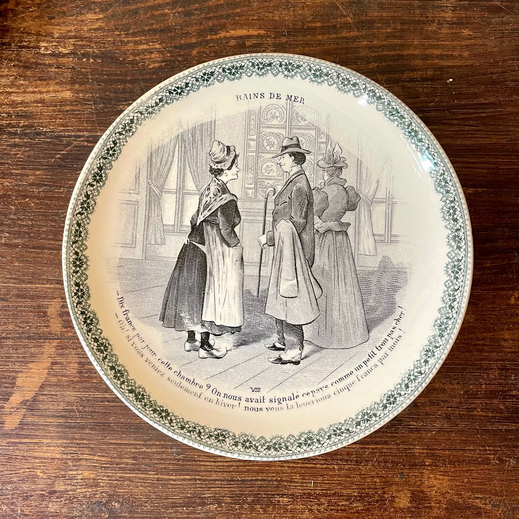 Assiette Terre de fer HB & Cie de Choisy-le-Roi avec illustration humoristique en noir et blanc et contour vert foncé.