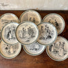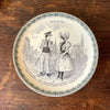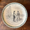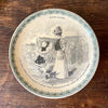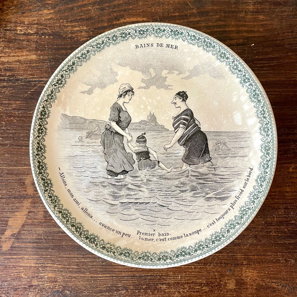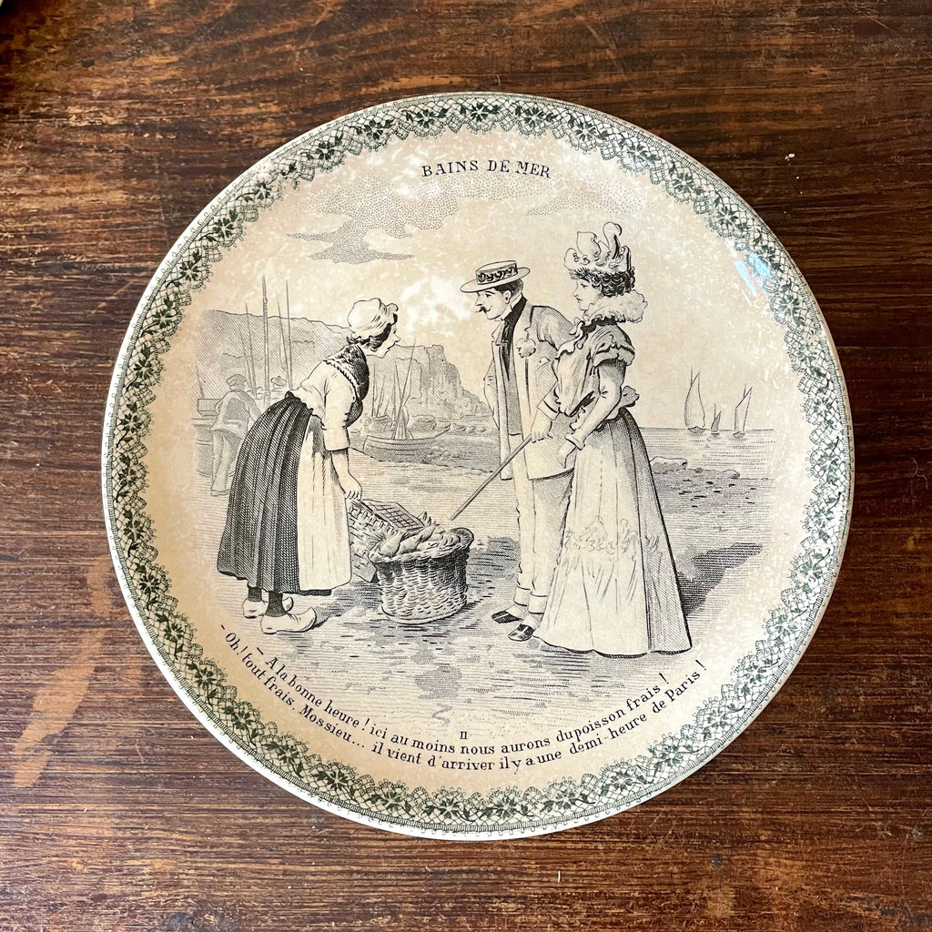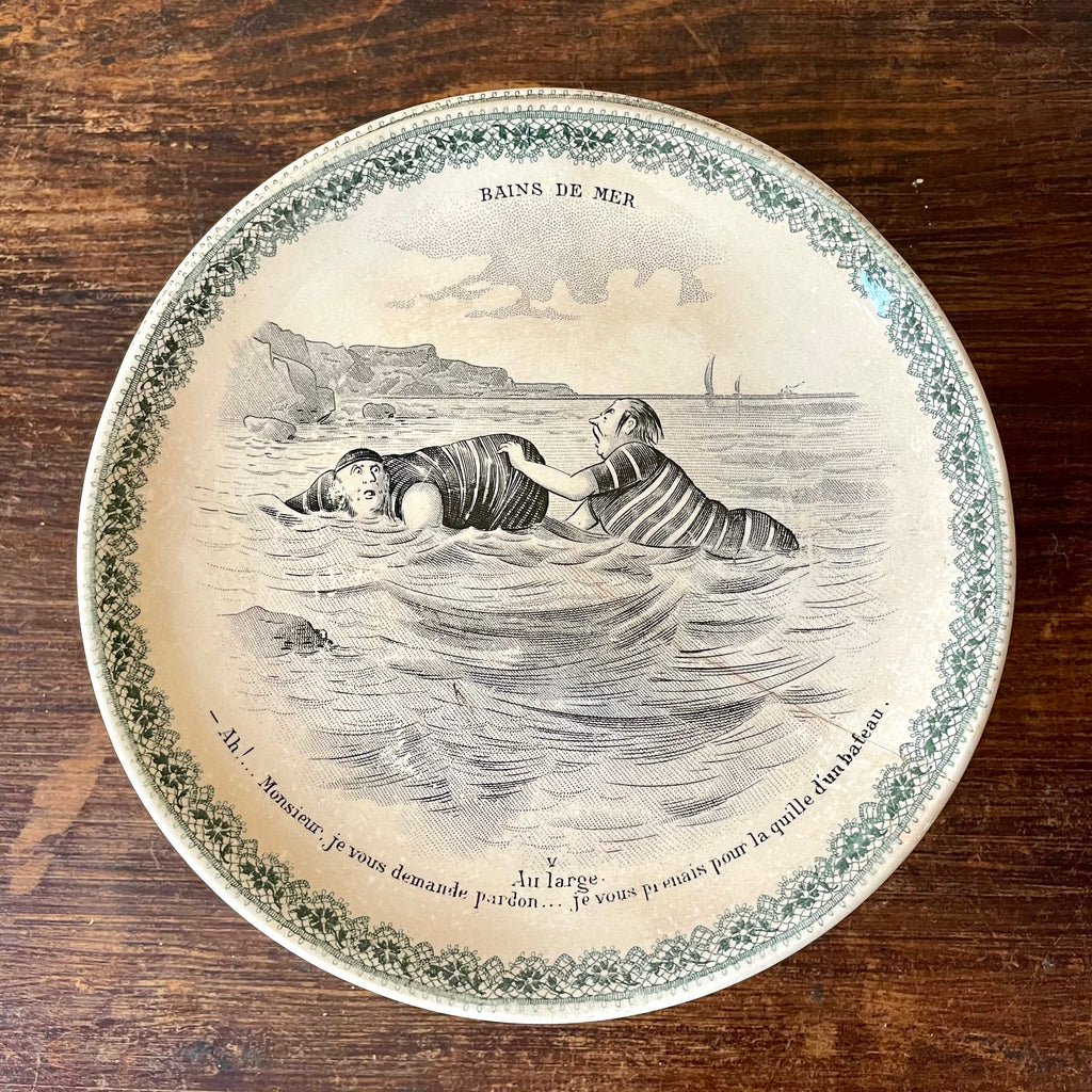 Assiette Terre de fer HB & Cie de Choisy-le-Roi avec illustration humoristique en noir et blanc et contour vert foncé.